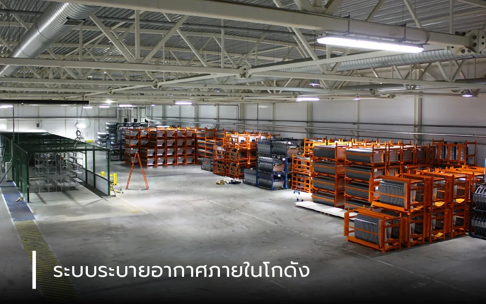 ระบบระบายอากาศภายในโกดังระบบระบายอากาศในโกดังมี 3 รูปแบบหลัก คือ ธรรมชาติ (ใช้ลมผ่านเกล็ดระบายอากาศ (Louver) หรือลูกหมุนบนหลังคา) เครื่องกล (ใช้พัดลมต่างๆ เช่น พัดลมไอเย็นอุตสาหกรรม (Evap), พัดลมยักษ์ (Big Fan), พัดลมเพดาน), และผสมผสาน (Hybrid) เพื่อลดความร้อน ความชื้น และระบายอากาศเสีย/สารเคมี ทำให้คุณภาพอากาศดีขึ้น ประสิทธิภาพการทำงานสูงขึ้น และป้องกันสินค้าเสียหาย